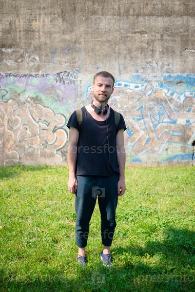 Хипстер слушает музыку в парке