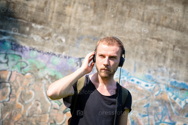 Хипстер слушает музыку в парке
