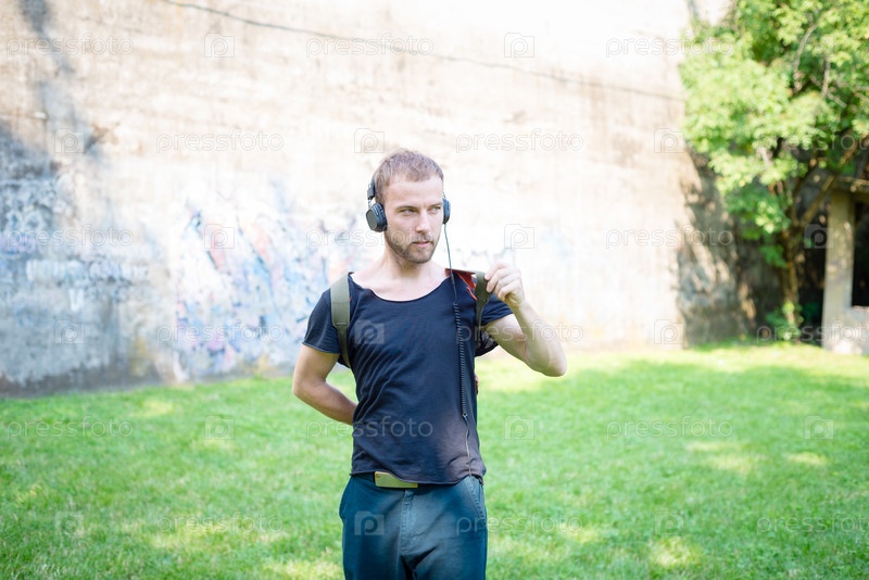 Хипстер слушает музыку в парке