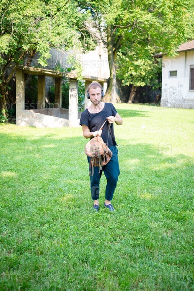 Хипстер слушает музыку в парке