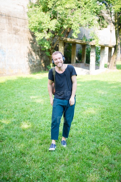 Хипстер слушает музыку в парке