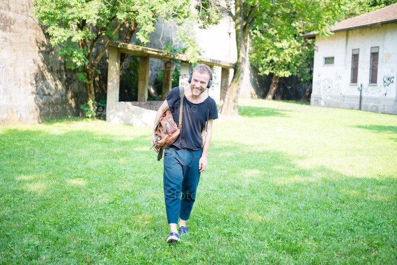Хипстер слушает музыку в парке