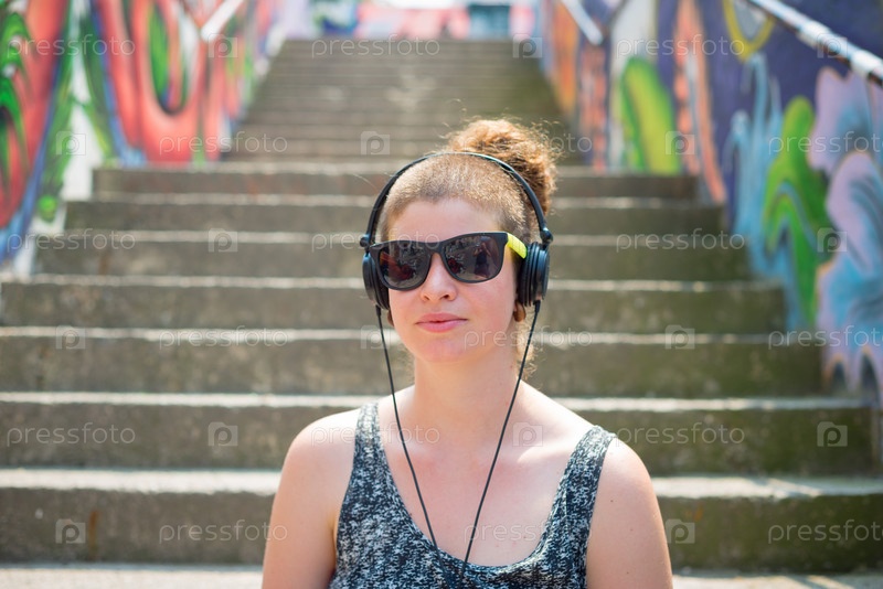 Стильная женщина слушает музыку