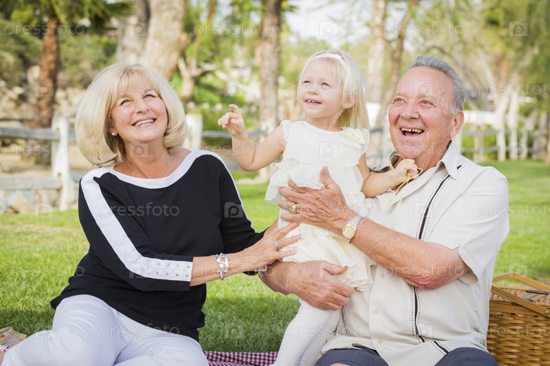 Мужчина и женщина играют с внучкой в парке