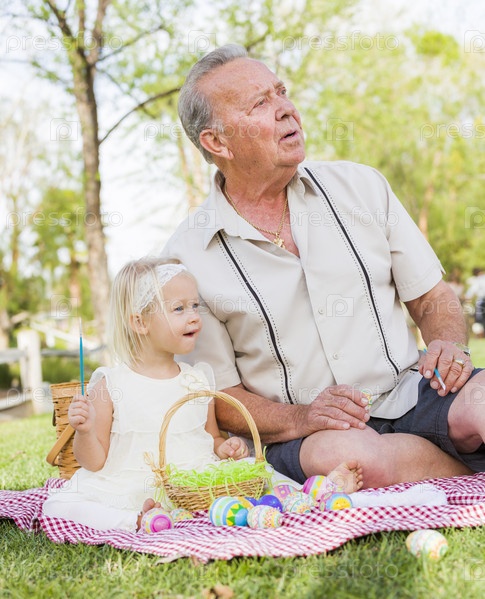Мужчина с внучкой раскрашивает пасхальные яйца