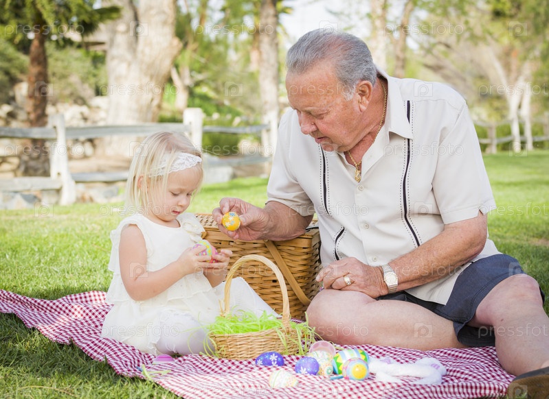 Мужчина с внучкой раскрашивает пасхальные яйца