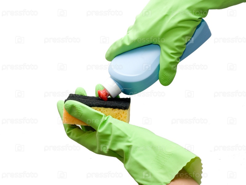 Руки в зеленых перчатках с губкой и моющим средством, изолированы на белом