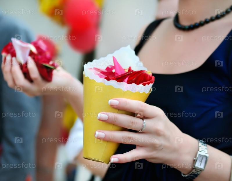 Девушка бросает лепестки роз на свадьбе