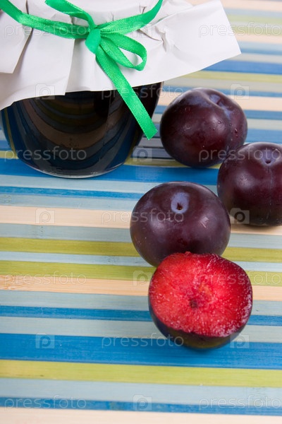 Банка джема и спелые сливы на столе