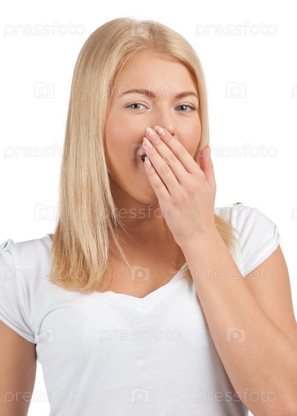 Привлекательная блондинка зевает, прикрывая рот рукой, на белом фоне