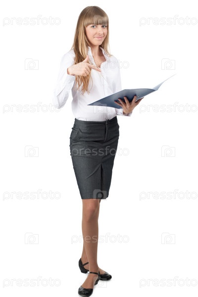 Деловая женщина показывает пальцем на папку с документами, белый фон