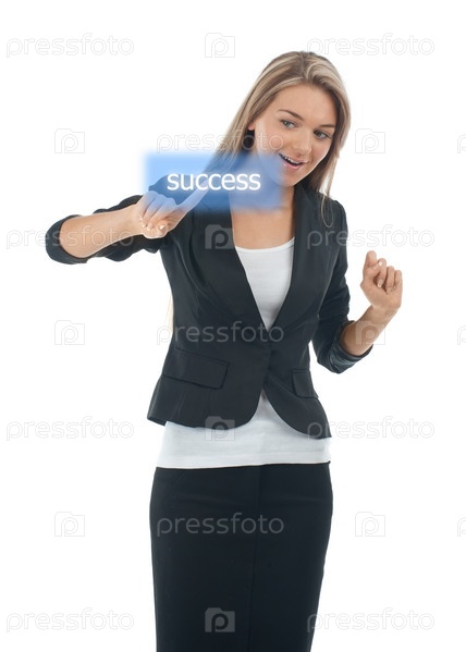 Деловая успешная женщина нажимает на сенсорную кнопку. Изолировано на белом фоне