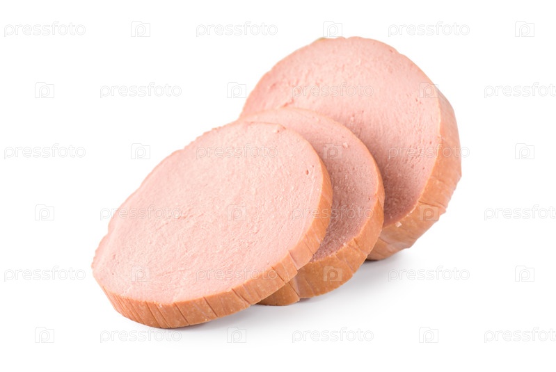 Три кусочка свиной колбасы на белом фоне