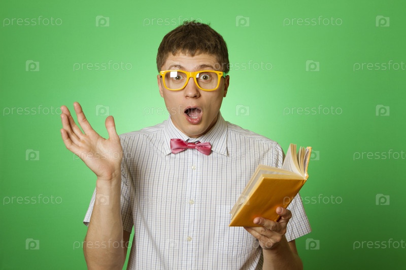 Молодой удивленный мужчина с книгой на зеленом фоне