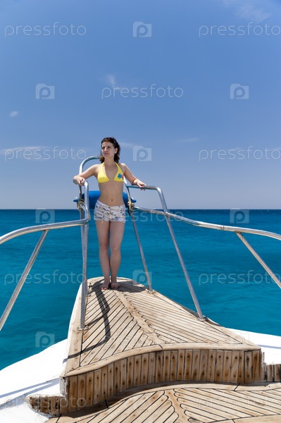 Девушка в купальнике на носу яхты