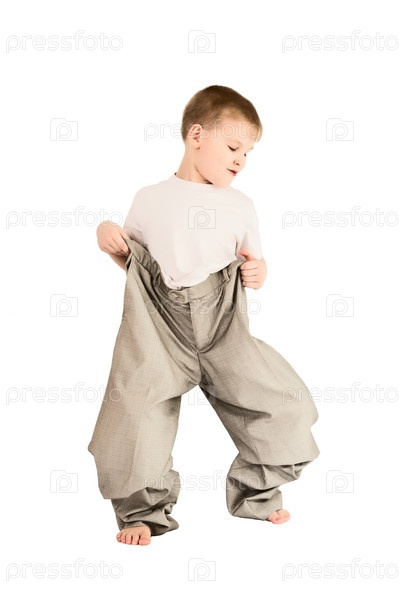 Маленький мальчик в брюках отца на белом фоне
