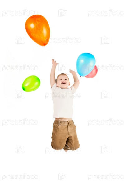 Портрет мальчика с воздушными шариками на белом фоне