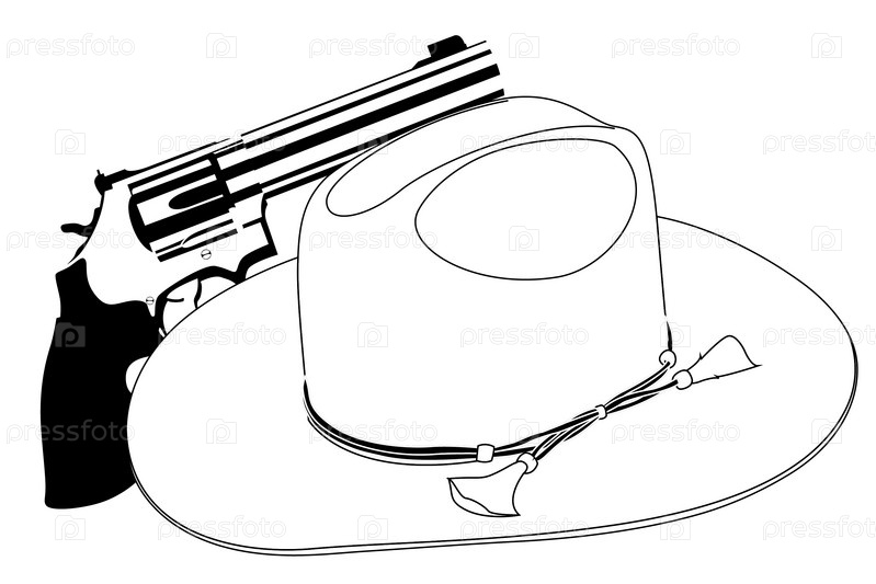 Револьвер и ковбойская шляпа на белом фоне