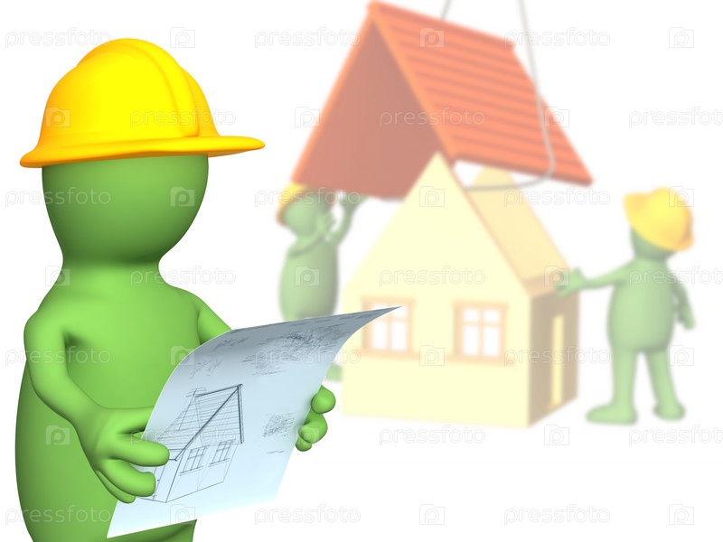 Стилизованный человек-строитель, рассматривающий чертежи дома