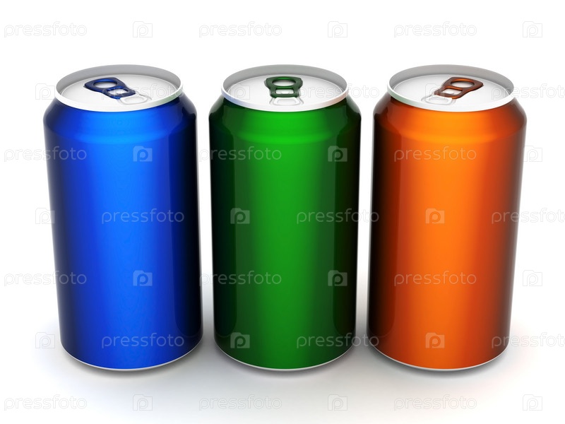Три разноцветных алюминиевых банки на белом фоне, 3d