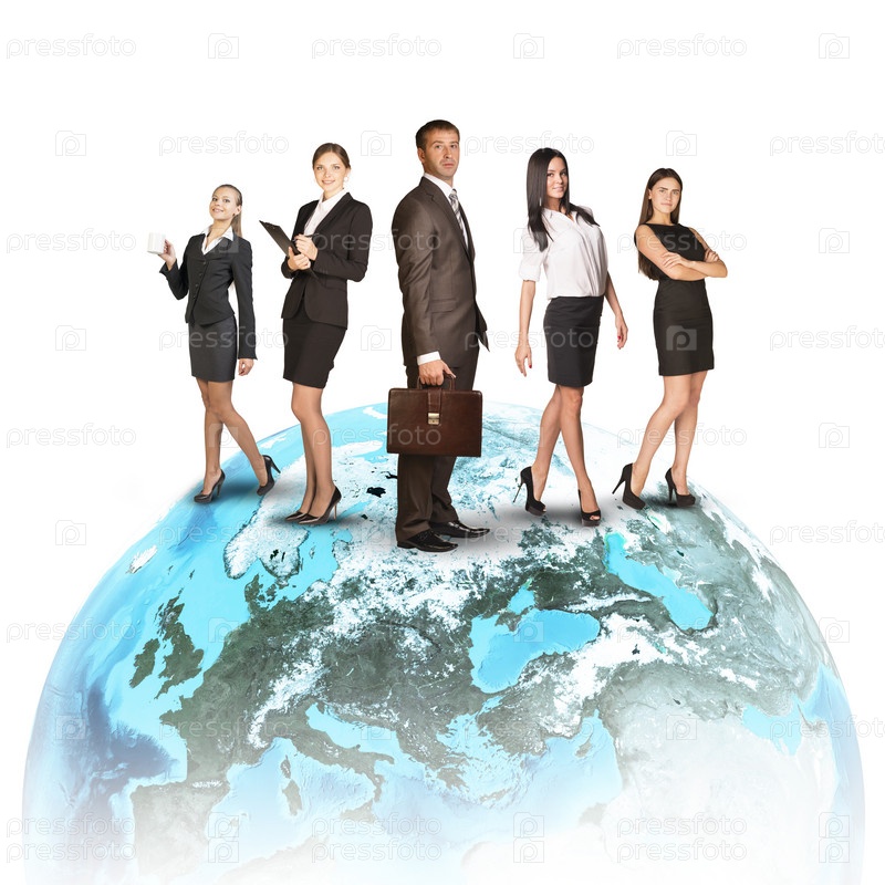 Деловые люди в костюмах на глобусе