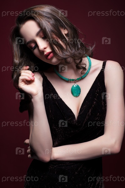 Женщина в черном платье на красном фоне