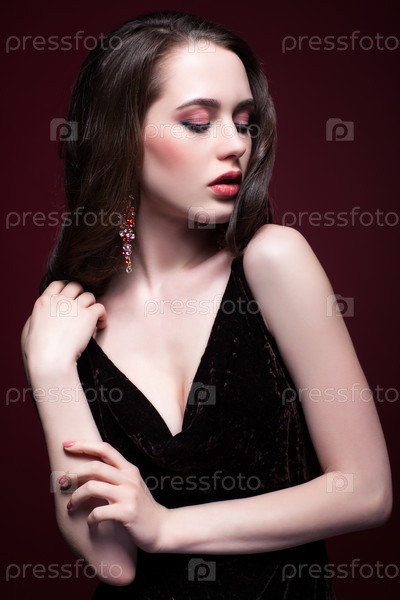 Женщина в черном платье на красном фоне
