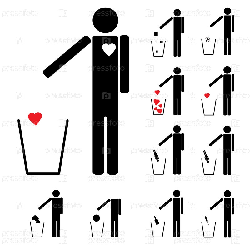 Набор из одиннадцати фигур, бросающих разный мусор в корзину
