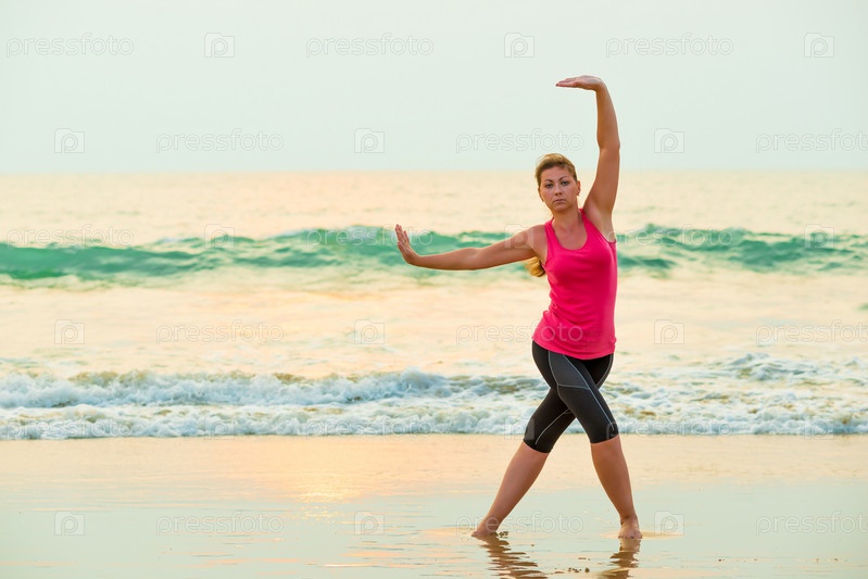Молодая женщина делает упражнения на берегу моря