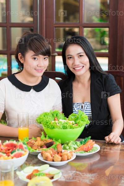 Азиатские мать и дочь за столом