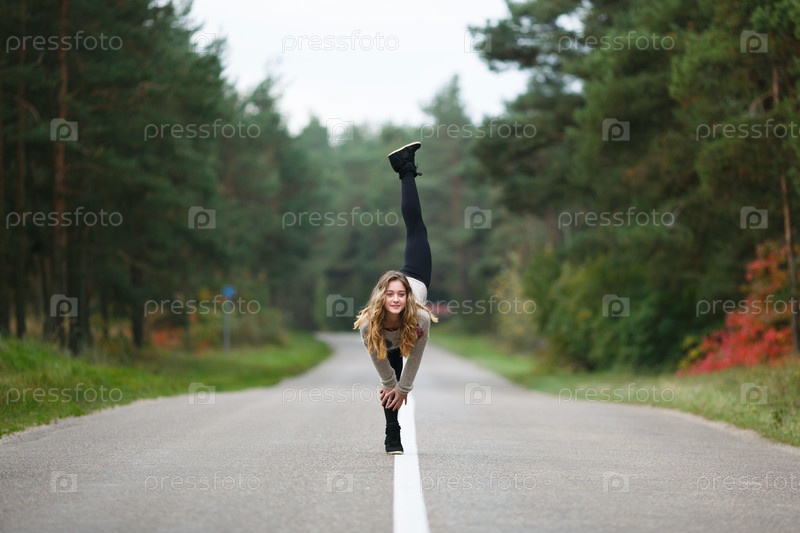 Девушка делает шпагат на дороге