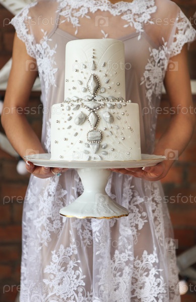 Невеста держит свадебный торт