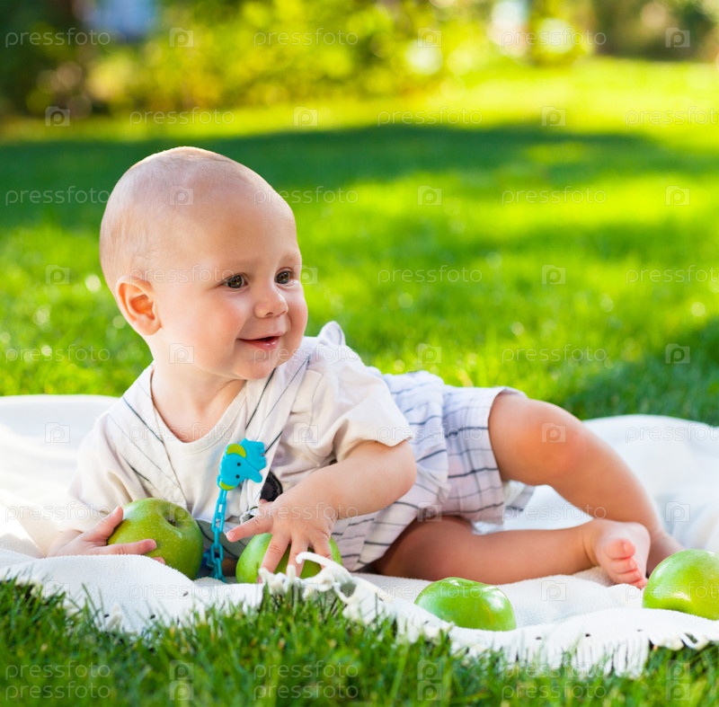 Счастливый мальчик с зелеными яблоками на зеленой траве