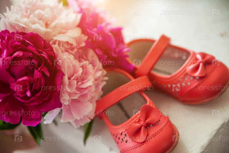 Букет из весенних цветов и детская обувь