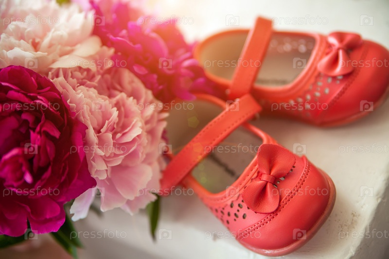 Букет из весенних цветов и детская обувь