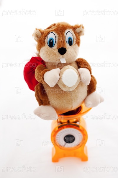 Удивленная плюшевая белка сидит на весах