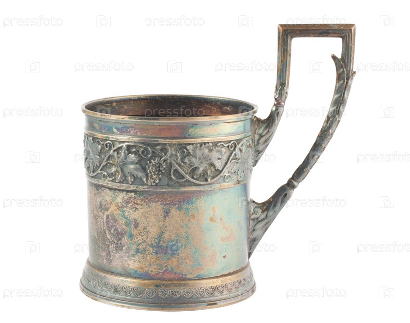 Старый серебряный подстаканник на белом фоне