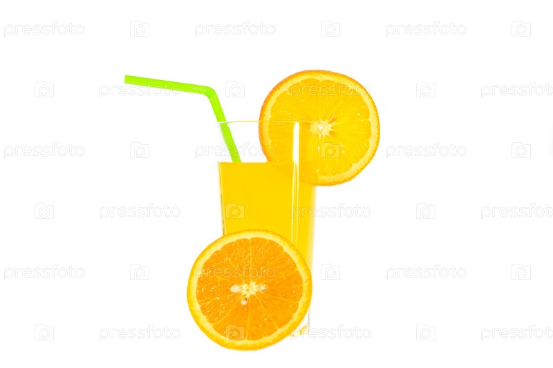 Апельсин и апельсиновый сок в стакане на белом фоне