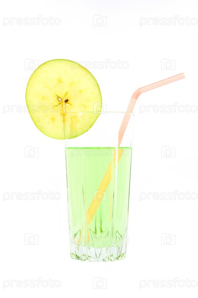 Стакан яблочного сока с соломой и ломтик яблока на белом фоне