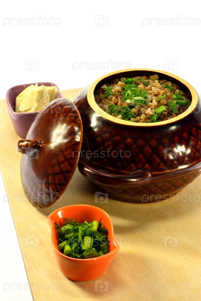 Горшок гречневой каши с маслом, зеленым луком и укропом