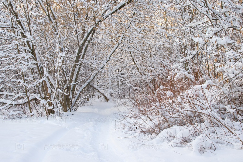 Тропа между деревьями, покрытая снегом