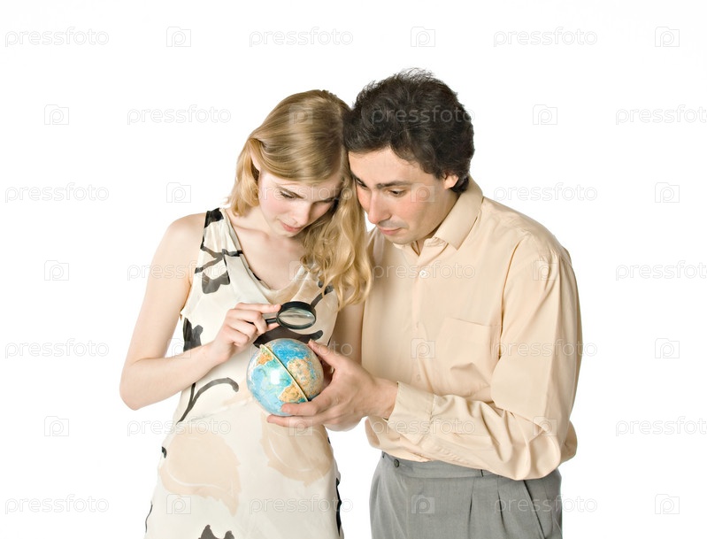 Пара смотрит на маленький глобус через лупу