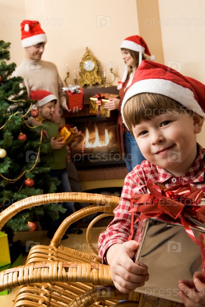 Портрет радостного маленького мальчика, держащего настоящее на фоне своих родственников