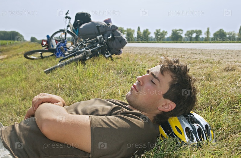 Молодой велосипедист лежит на земле с закрытыми глазами