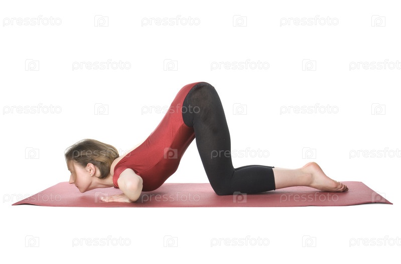 Женщина делает упражнения на коврике на белом фоне