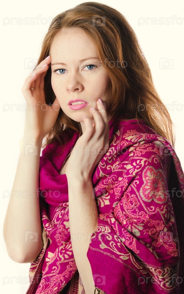 Рыжеволосая девушка в малиновом платке