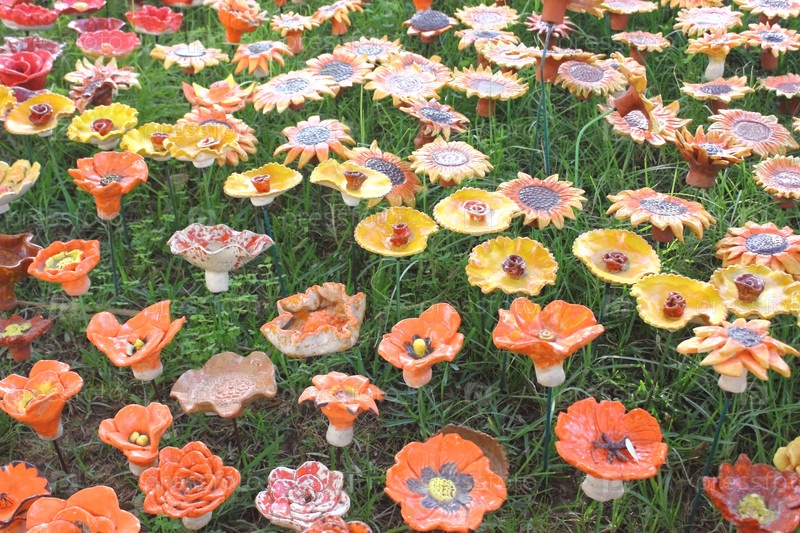 Керамические цветы на клумбе