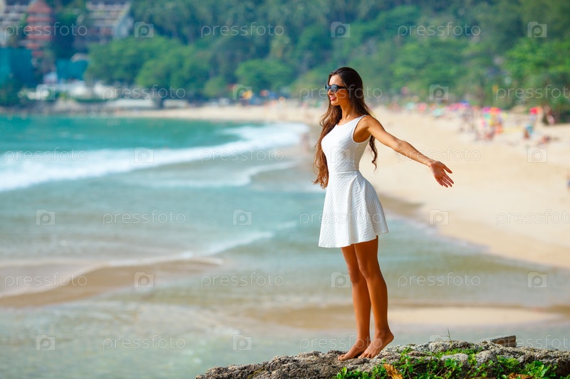 Брюнетка в белом платье на пляже