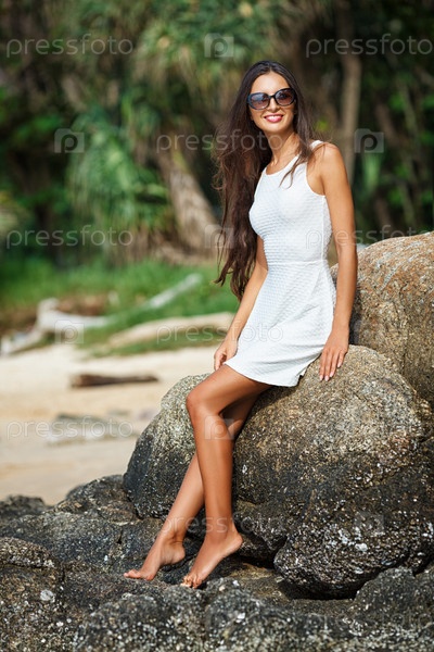 Красивая женщина в белом платье на пляже