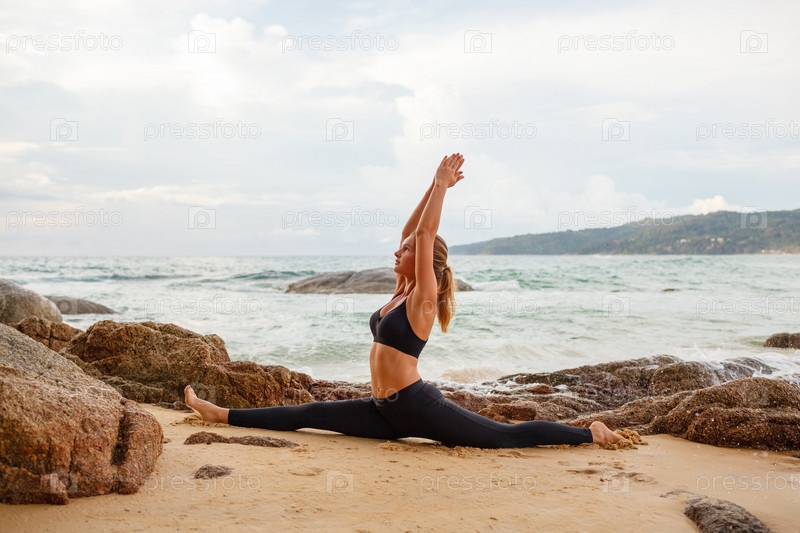 Женщина занимается йогой на пляже